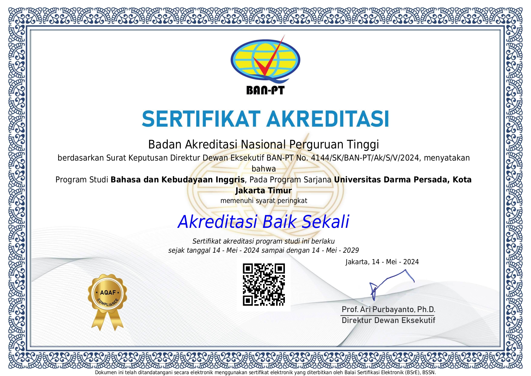Program Studi Bahasa dan Kebudayaan Inggris didirikan pada tanggal 8 Juli 1986 berdasarkan SK Pendirian no. 15/KOP.III/S.VII/1986 dan izin penyelenggaraan pada 8 Juli 1986. Universitas Darma Persada saat itu dipimpin oleh Dr. Syarif Thayeb (almarhum) selaku Rektor hingga tahun 1989, tahun 1990 sampai dengan tahun 2002 digantikan oleh Drs. W.D. Sukisman dan tahun 2002 digantikan oleh Dr. H.Tb. Lily Satari, M.Sc., pada tahun 2006 sampai dengan 2011 dipimpin Prof. Dr. Ir. Kamaruddin Abdullah, IPU. Kemudian digantikan pada tahun 2011 oleh Dr. Oloan P. Siahaan.